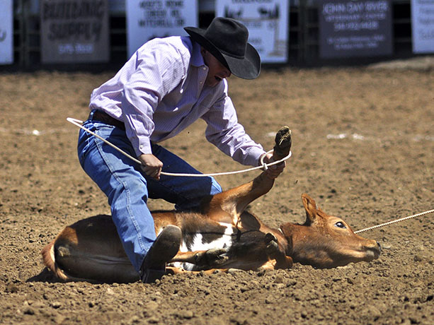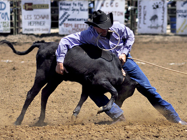 Once the gates open, the rider's goal is to catch the calf by lassoing it around its neck, dismount from the horse, run to the calf, and restrain it by tying three legs together, in as short a time as possible.