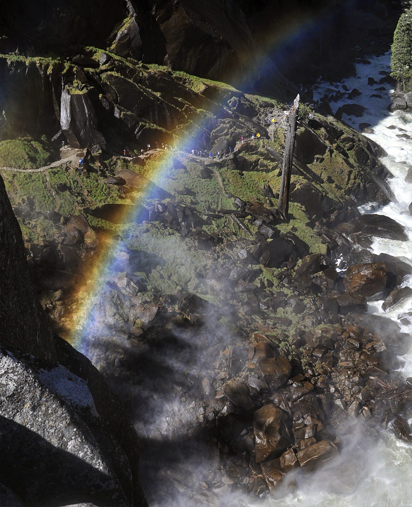 Through the rainbow I spot a procession of hikers.