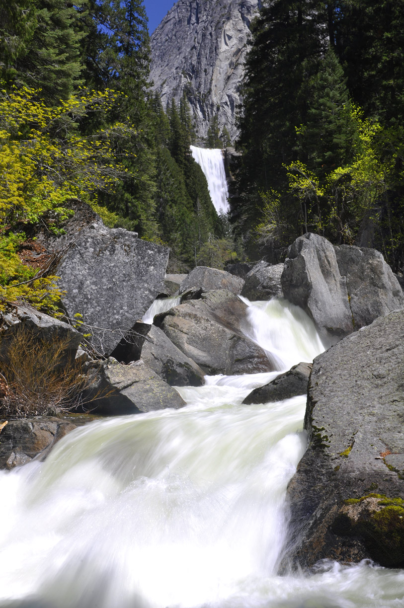 Sounds of rushing water fill the air as we get an early glimpse of Vernal Falls.